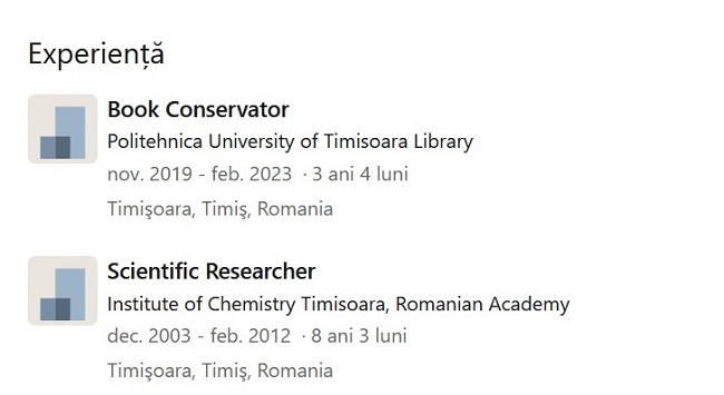 Am găsit, pe site-ul Bibliotecii Naționale a României, două anunțuri de concurs pentru posturi de conservator carte, la intervale diferite de timp: pentru unul dintre ele se cereau studii superioare în arheologie/conservare/muzeologie, iar pentru celălalt, care presupunea “atribuții de investigații fizico-chimice și biologice în cadrul Serviciului Conservarea și Restaurarea Documentelor”, se cereau studii superioare într-unul din domeniile biologie, chimie sau biochimie. Nici vorbă de studii exclusiv în domeniul inginerie chimică, bașca master în inginerie chimică!