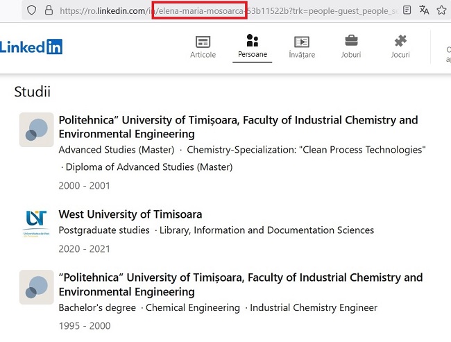 Așa cum v-ați dat deja seama, Elena Maria Moșoarcă este absolventă de inginerie chimică, chiar la UPT, și are și un master în același domeniu, tot la UPT. Elena Maria Moșoarcă lucrase opt ani și trei luni (decembrie 2003 – februarie 2012) pe postul de cercetător științific la Institutul de Chimie din cadrul filialei locale a Academiei Române, după care a urmat o pauză în activitate de șapte ani și jumătate, adică până la angajarea la UPT. Am aflat aceste detalii consultând profilul de pe www.linkedin.com al doamnei Moșoarcă, profil care, după dialogul cu soțul său, a devenit brusc privat. O măsură tardivă, evident.