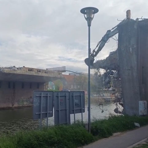 Vizibil, șantierul avansează. Însă ce înseamnă, concret, „calitatea pe care ne-o dorim” atunci când, în același timp, demolarea se face în imediata vecinătate a bicicliștilor și a traficului, iar molozul nu este colectat controlat, ci ajunge, parțial, în apă sau pe mal.