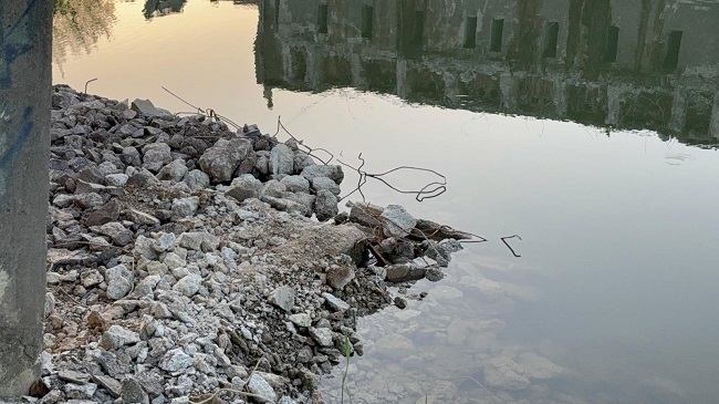 Nu se observă un sistem organizat de preluare a resturilor. În schimb, ceea ce se vede este o combinație de cădere directă a materialelor în zona de mal și acumulări de moloz depozitate informal, la marginea apei.
