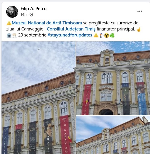 Mai apoi, pe 28 septembrie 2024, tot el, tot pe Facebook, anunța că expoziția este finanțată de către Consiliul Județean Timiș, deși știa despre această susținere financiară încă din ianuarie 2024, când președintele în exercițiu al CJ Timiș, Alin Nica, anunța public în mass media, că expoziția Caravaggio de la Timișoara va avea loc, cu aportul financiar al Consiliului Județean, instituție căreia Muzeul de Artă i se subordonează.