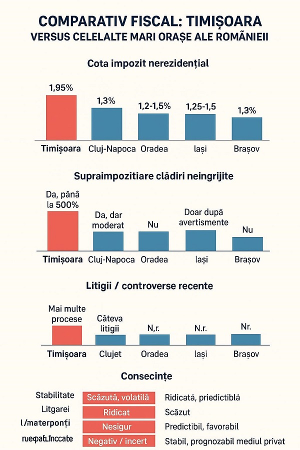 O analiză comparativă între Timișoara și alte orașe mari din România (Cluj-Napoca, Oradea, Iași, Brașov), pe tema impozitelor pe clădiri nerezidențiale, strategiilor fiscale locale și implicațiilor economice.